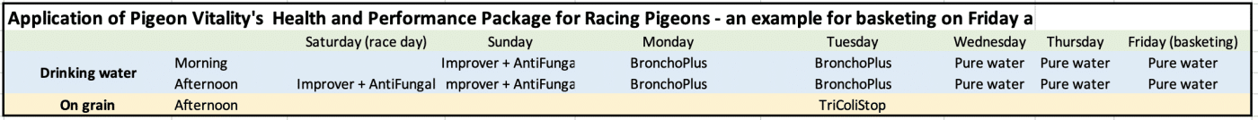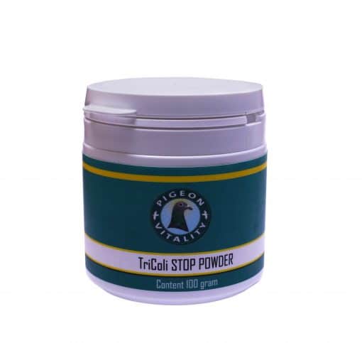 TriColi STOP Powder. Add1 heaped measure level (8 gram) to the grain and mix well. The grain can in advance be moistured by e.g. Omega 3. 1 kilo of this grain mixture is given to 50 pigeons, so each pigeons eats at least 20 gram in average