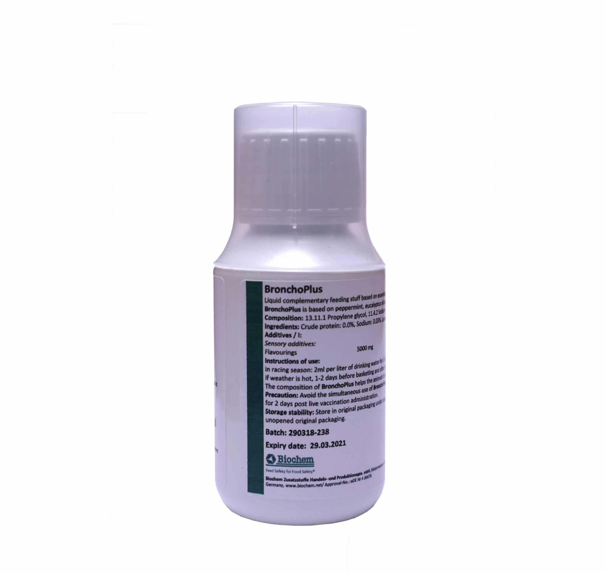 BronchoPlus is a well-balanced formulation based on different natural essential oils based on peppermint, eucalyptus oil, and menthol. The composition of BronchoPlus helps the pigeons to decrease the amount of excessive mucus in the respiratory tract.